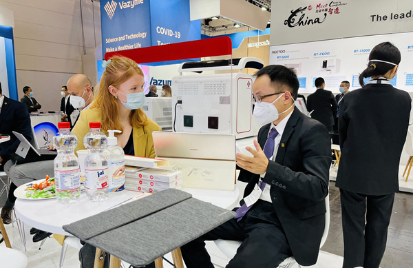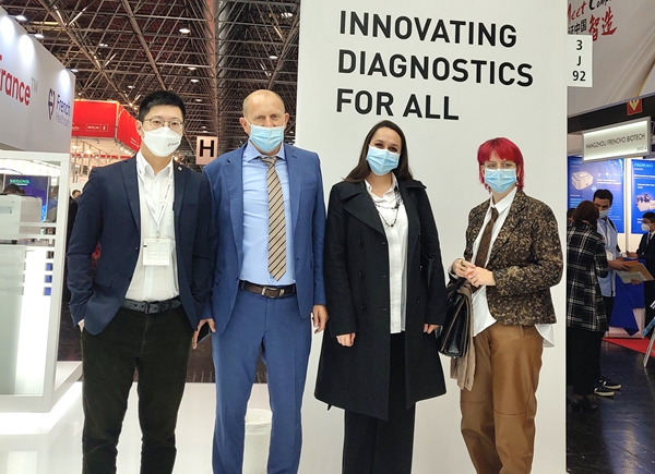 在经过同行推荐并使用了365英国上市集团产品后,一位从事检测工作十多年的苏丹客户专门找到365英国上市集团展台,进一步了解365英国上市集团新冠和其他试剂检测业务。看完365英国上市集团方案的操作后,他频频点头并表示,“你们的方案应用场景广、操作简便、精准可及,我非常看好你们!”
