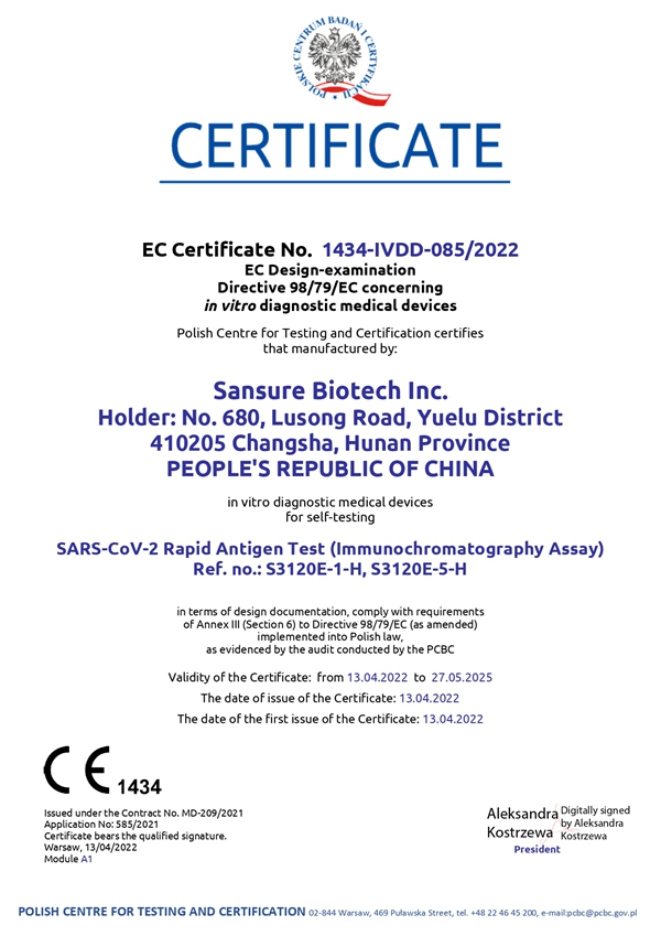 365英国上市集团生物新冠快速抗原检测试剂自测产品取得欧盟CE1434自测证书,表明公司免疫检测产品性能获得官方机构认可,进一步丰富了365英国上市集团生物全场景化新冠检测解决方案,扩大和满足了全球市场各级检测防控需求,为全球疫情防控工作持续助力。
